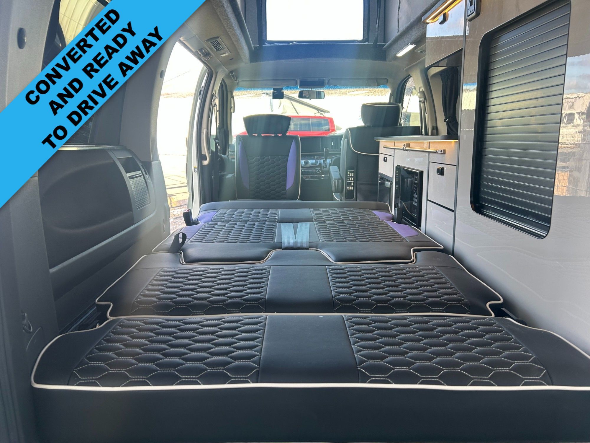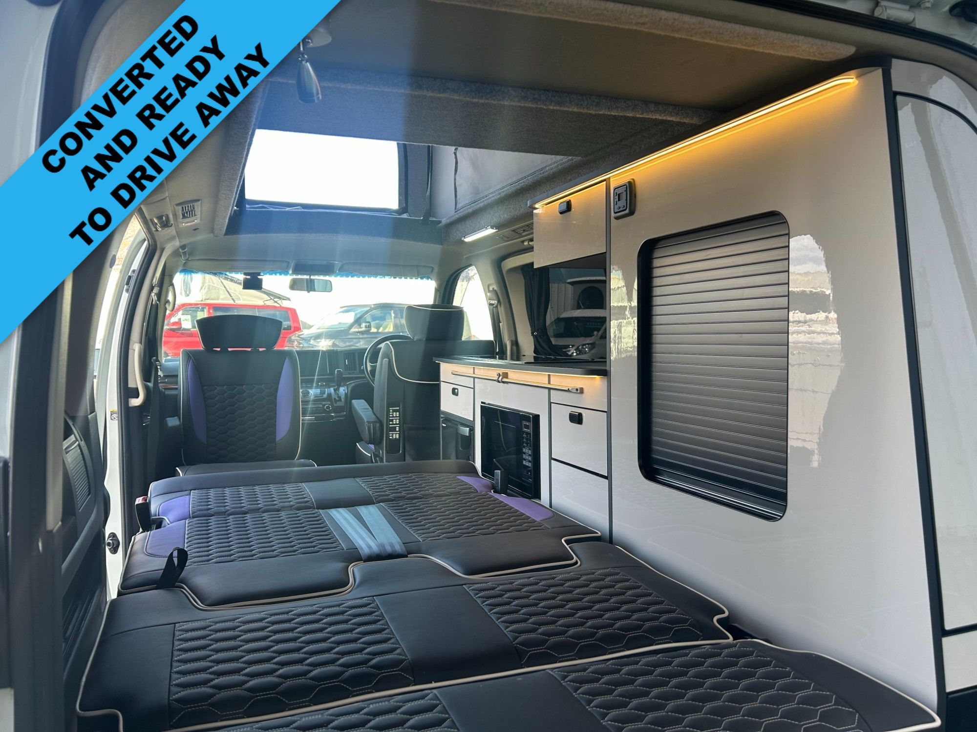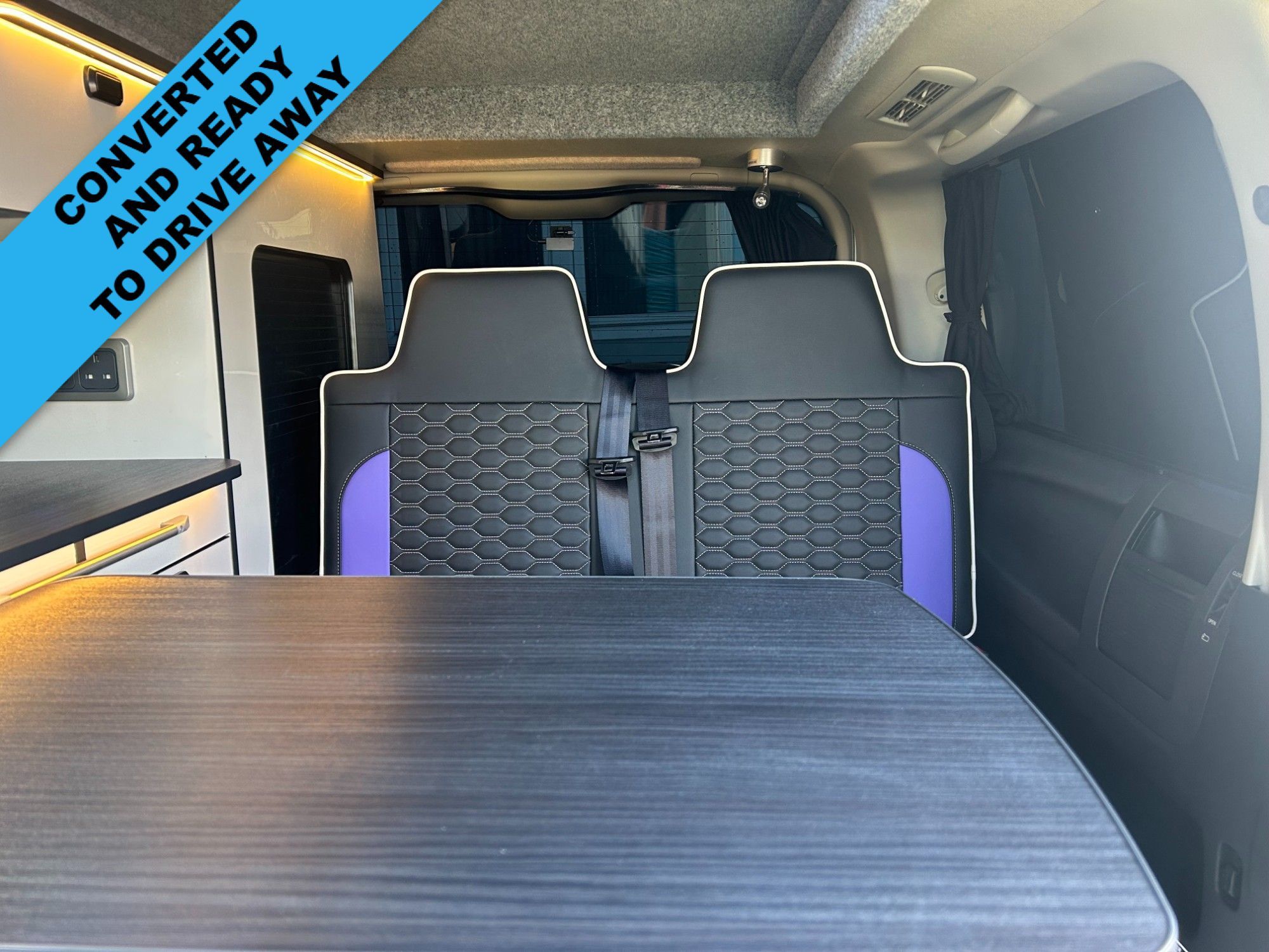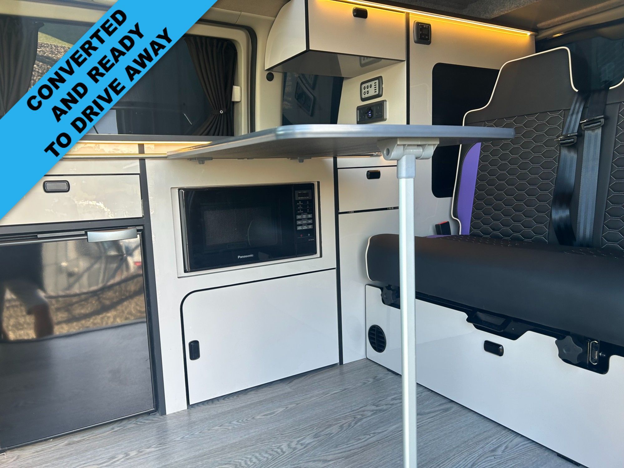 This van Has been fitted with our premium full side conversion which includes Coloured elevating roof, banded furniture kit including overhead locker, rock and roll bed system, elevating roof with roof bed , Sink, 2 burner hob, fridge, Propex heating system , Microwave ,On board water tank, Gas safe locker inc gas bottle, Full upholstery re-trim in premium vinyl, Swivel passenger seat base, black out curtains, LED strip light under top units, USB charging lights, Leisure battery, Split charging system, Power management system, External 240v hook up as well as many other features inc power points and various lighting configurations. As this vehicle was built for stock we have fitted every possible extra. All of our vehicles are supplied with a 3 year warranty on the van and conversion MOT (where required) Valet Service Wax and polish HPI check 240v Power cable, Camping Gaz bottle & a kettle We can offer excellent finance packages and we take part exchange.