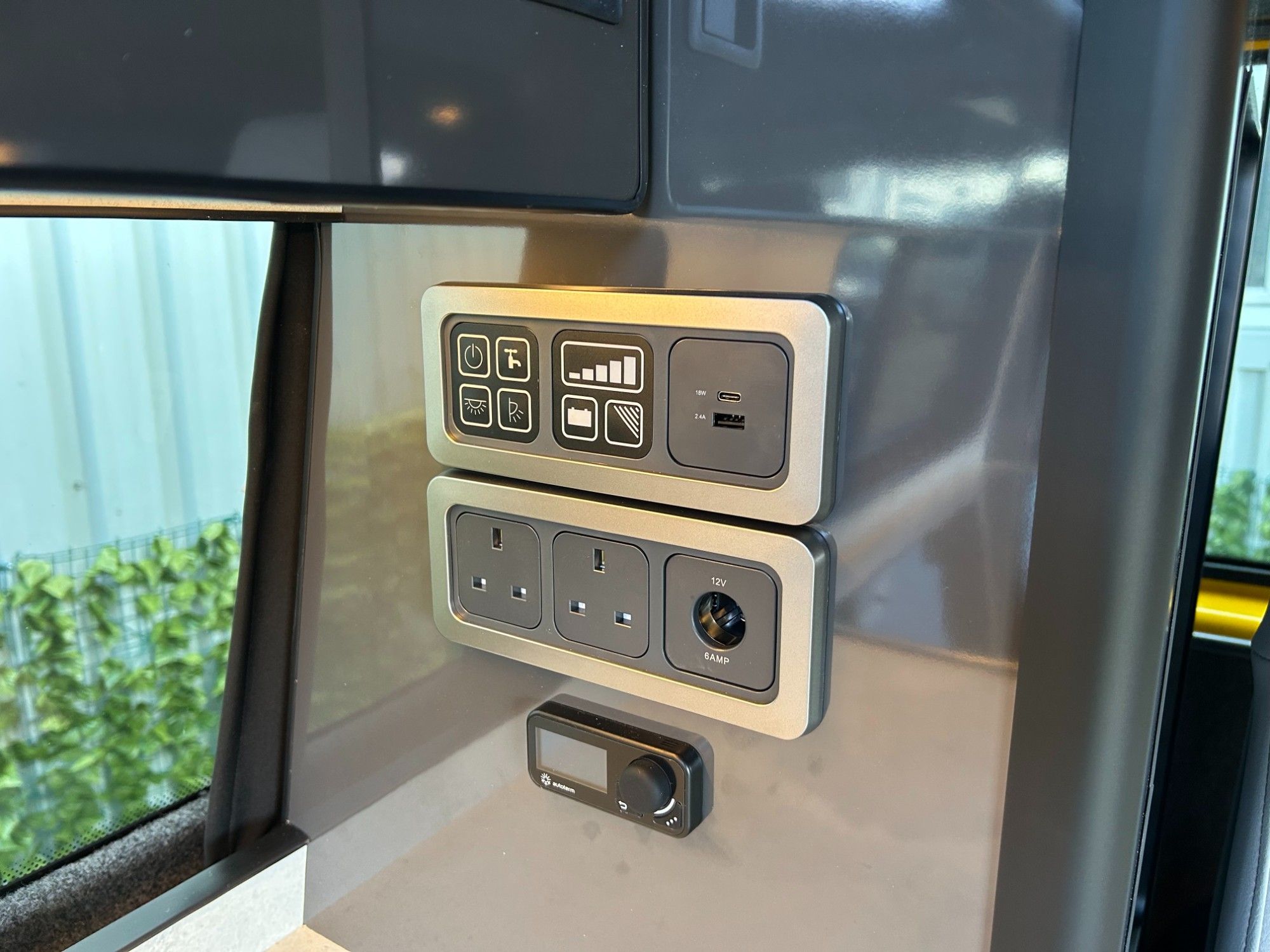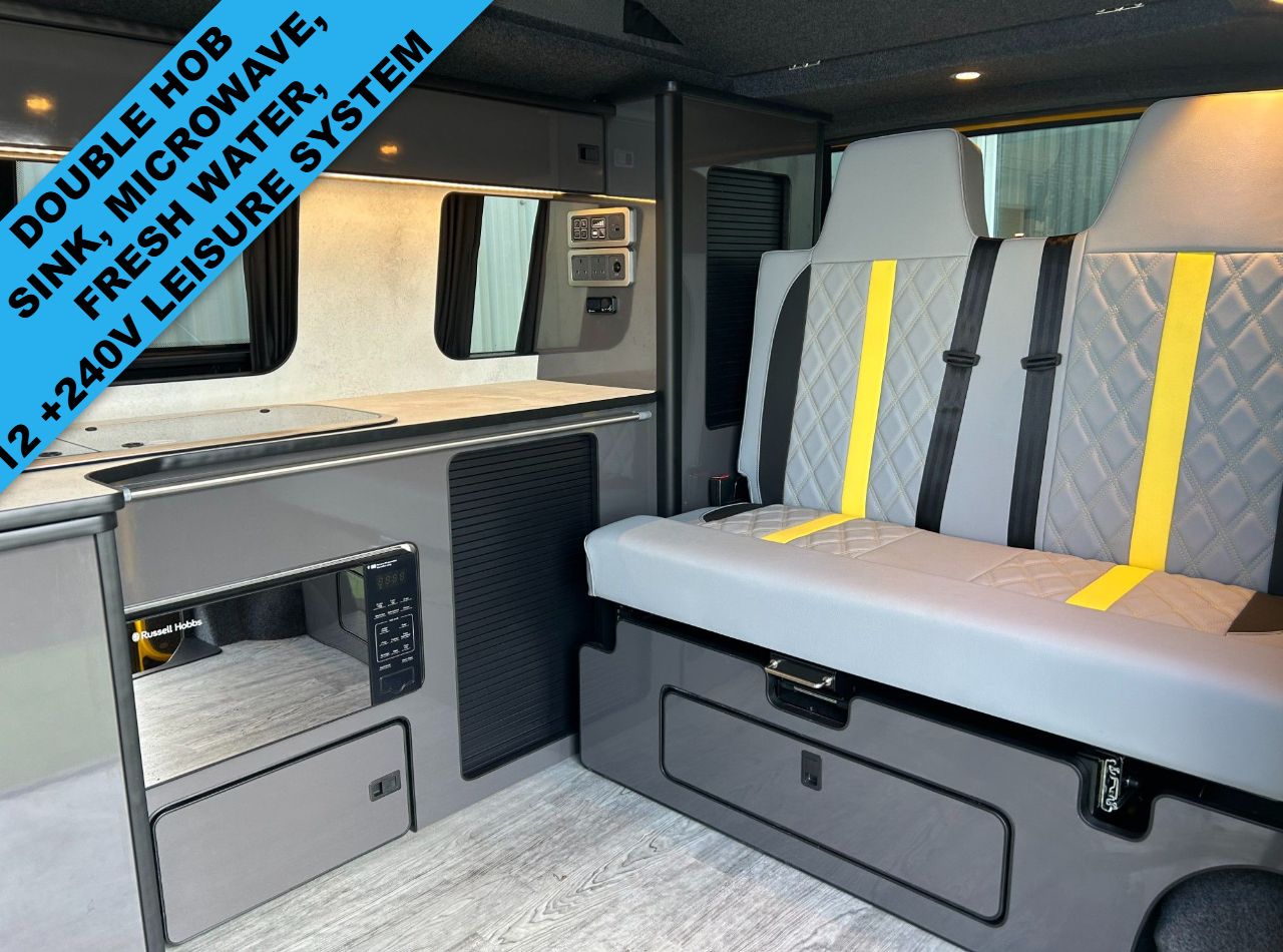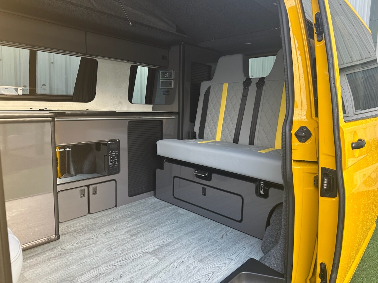 Stunning Volkswagen T6.1 150BHP DSG AUTO newly converted with a premium full side conversion which includes Fully edge banded furniture kit in gloss grey, Rock &Roll bed, Twin hob, Sink, autoterm diesel heater, Fridge, LED lighting, black out curtains , Elevating pop top with roof bed, Front swivel bench seat, dining table , USB reading lights & Full upholstery re-trim front & rear. Upholstery in black with striking orange highlights and complementing bold splash back DOUBLE BURNER HOB SINK AND ONBOARD WATER SYSTEM 12 v FRIDGE RUSSELL HOBS MICROWAVE WEST DUBS ROOF CAB AIR CON Externally this van has been fitted with 20" vw wheels. The van is Lowered 40mm, Black side bars, Front Splitter & rear spoiler. can be fitted to your preference . Ask about our amazing deals on tow bars and drive away air awnings