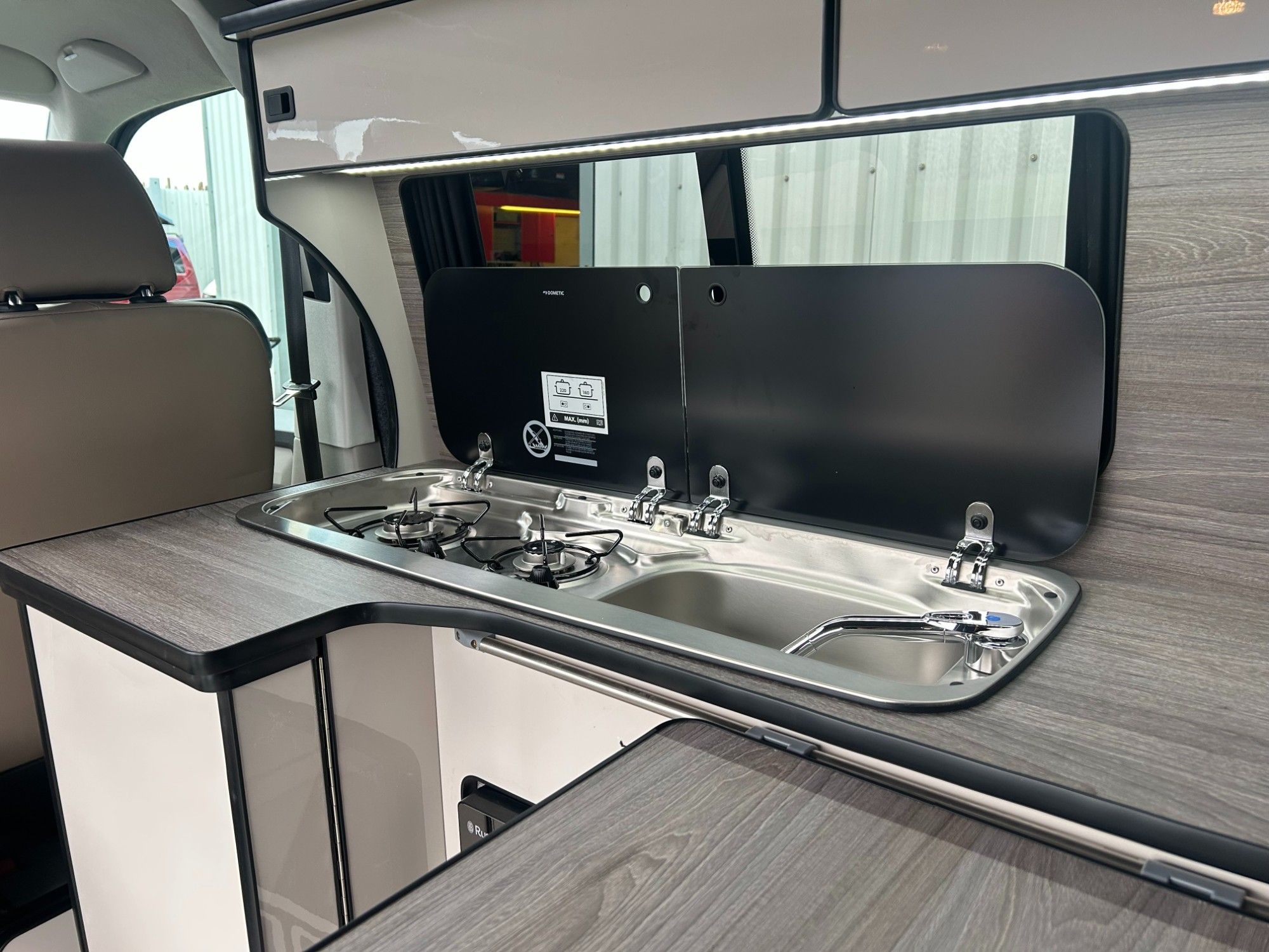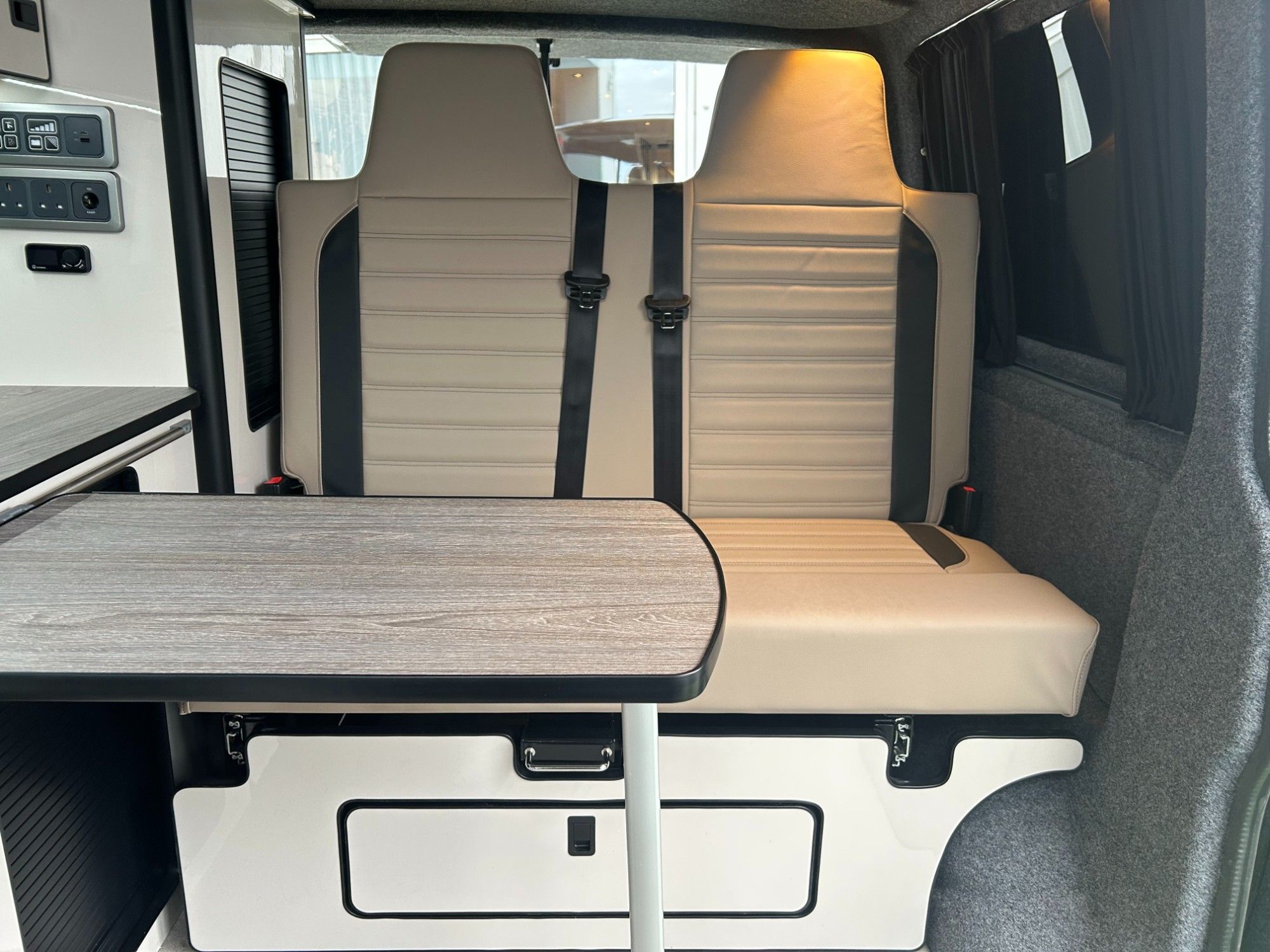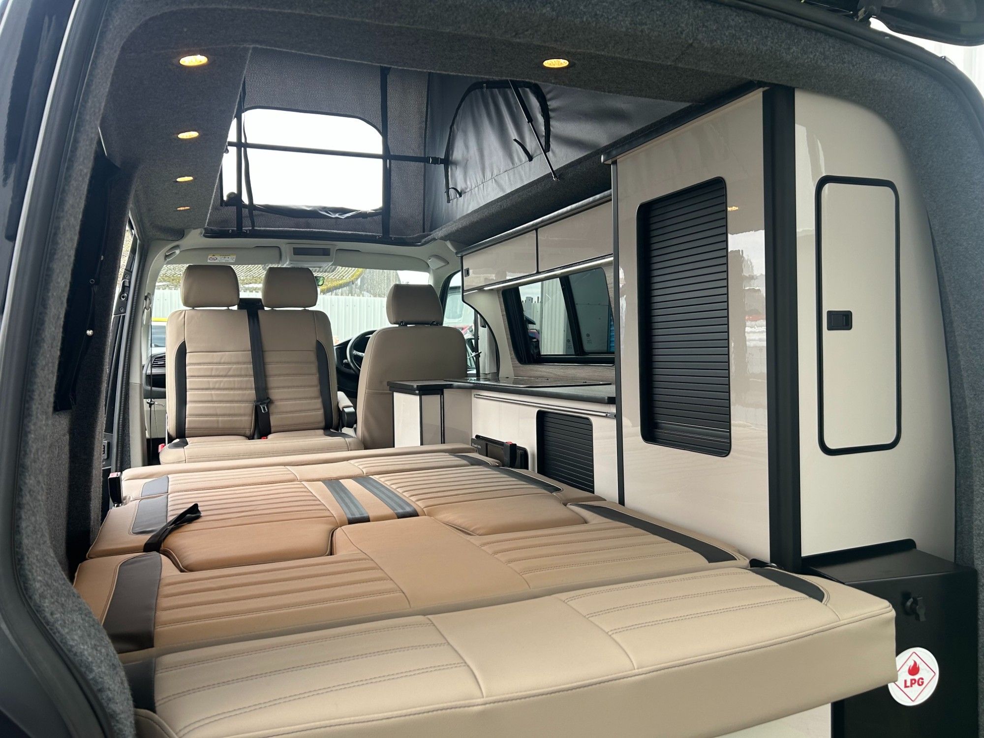 Stunning Volkswagen T6 newly converted with a premium full side conversion which includes full furniture kit in gloss grey, Rock &Roll bed, Twin hob, Sink, autoterm diesel heater, Fridge, LED lighting, Microwave, Black out curtains , Elevating pop top with roof bed, Front swivel bench seat, Dining table , USB reading lights & Full upholstery re-trim front & rear. Upholstery in cream with striking brown mondeo panels and complementing bold splash back . West Dubs roof,Cab Air Con, 20 inch swapper style alloys. .