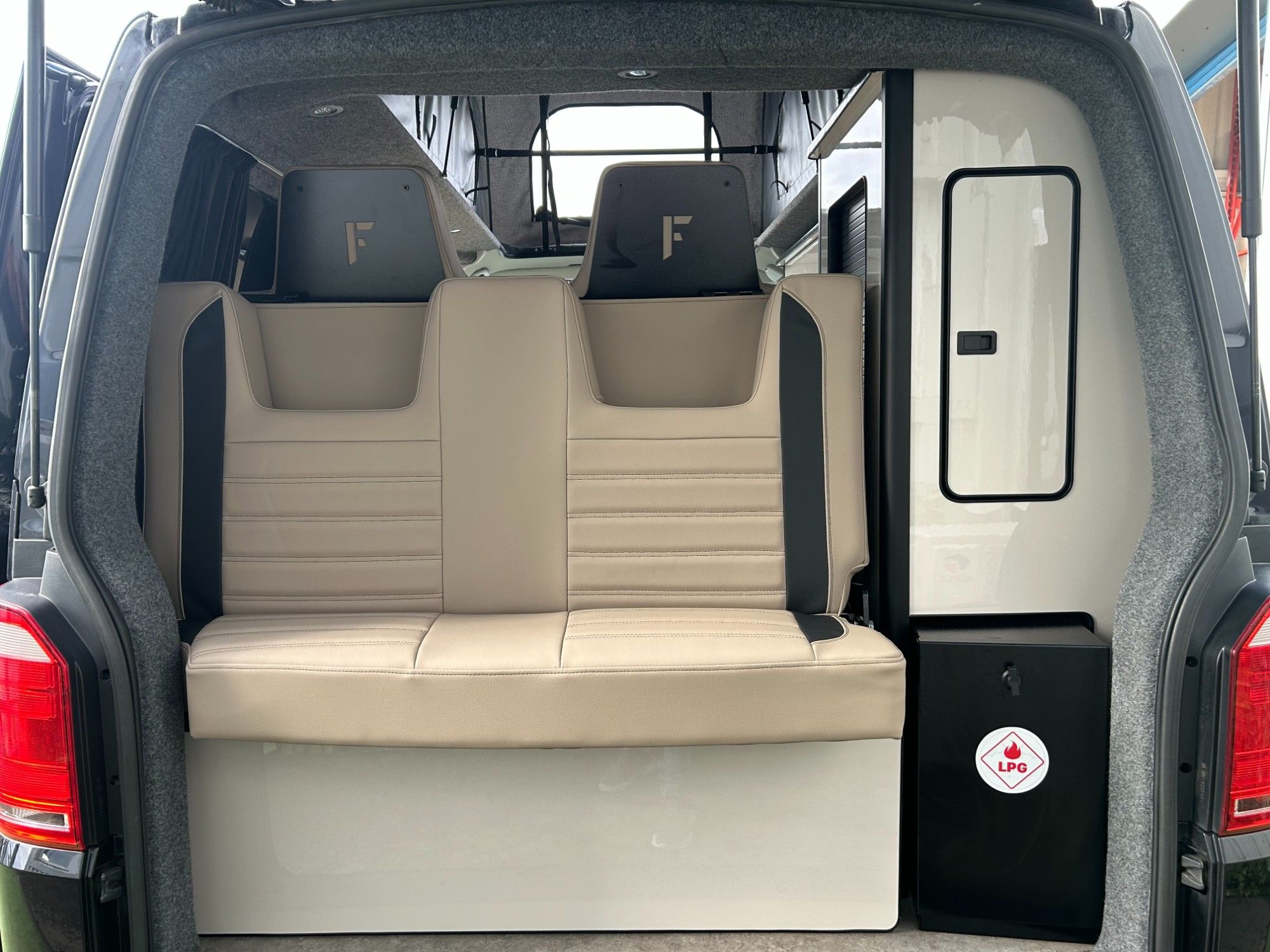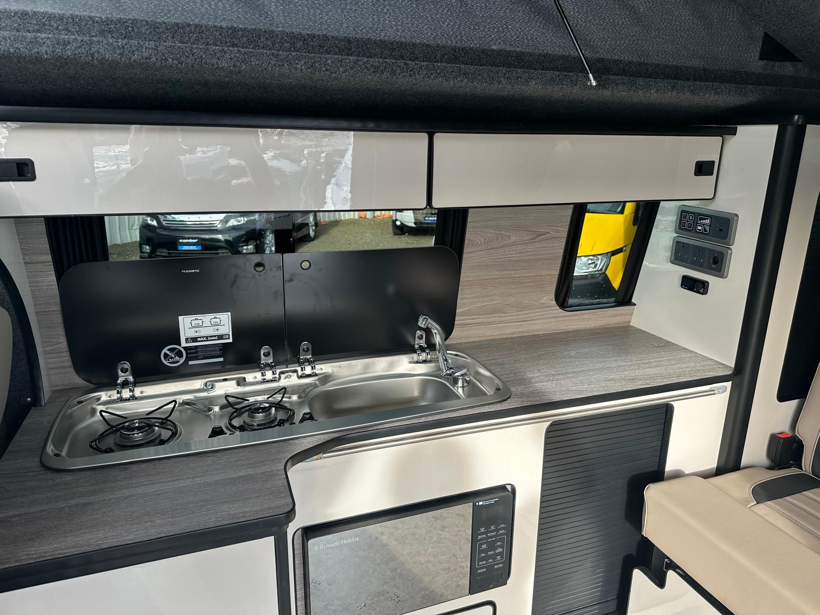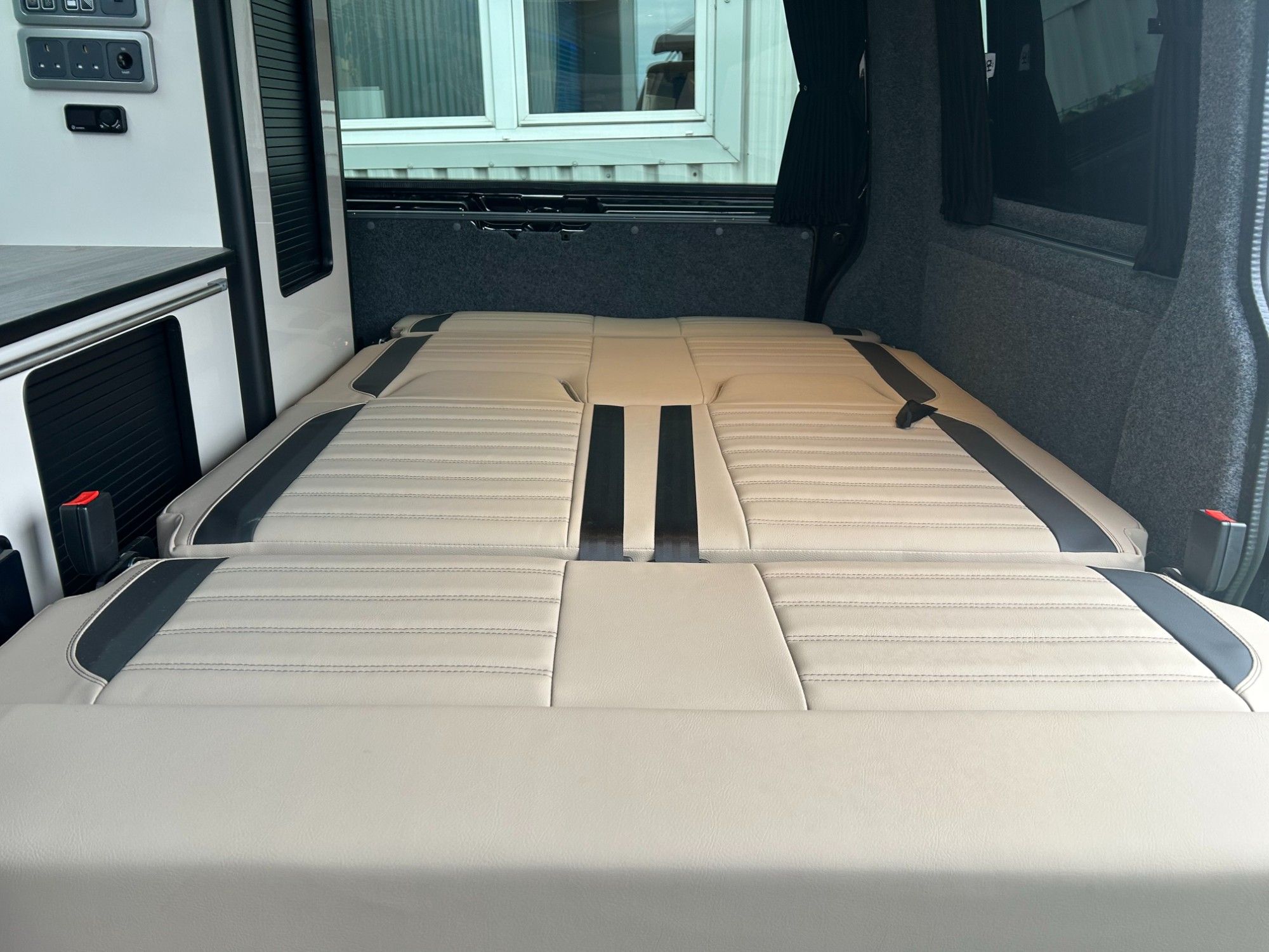 Stunning Volkswagen T6 newly converted with a premium full side conversion which includes full furniture kit in gloss grey, Rock &Roll bed, Twin hob, Sink, autoterm diesel heater, Fridge, LED lighting, Microwave, Black out curtains , Elevating pop top with roof bed, Front swivel bench seat, Dining table , USB reading lights & Full upholstery re-trim front & rear. Upholstery in cream with striking brown mondeo panels and complementing bold splash back . West Dubs roof,Cab Air Con, 20 inch swapper style alloys. .