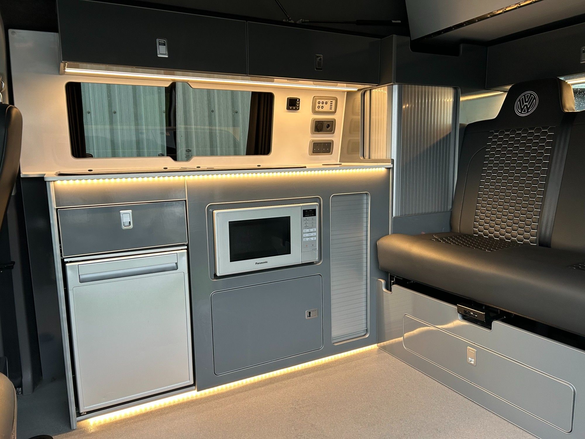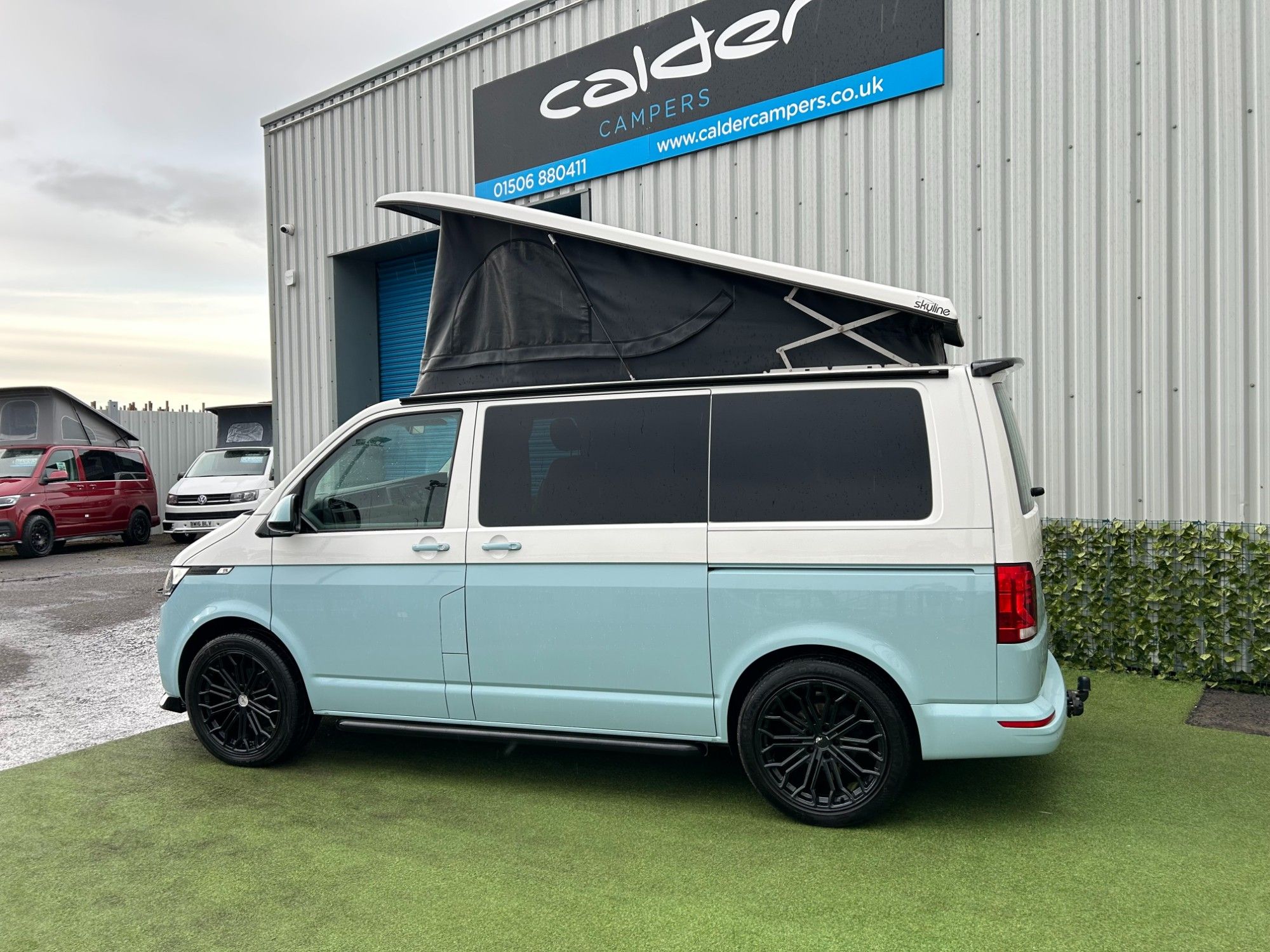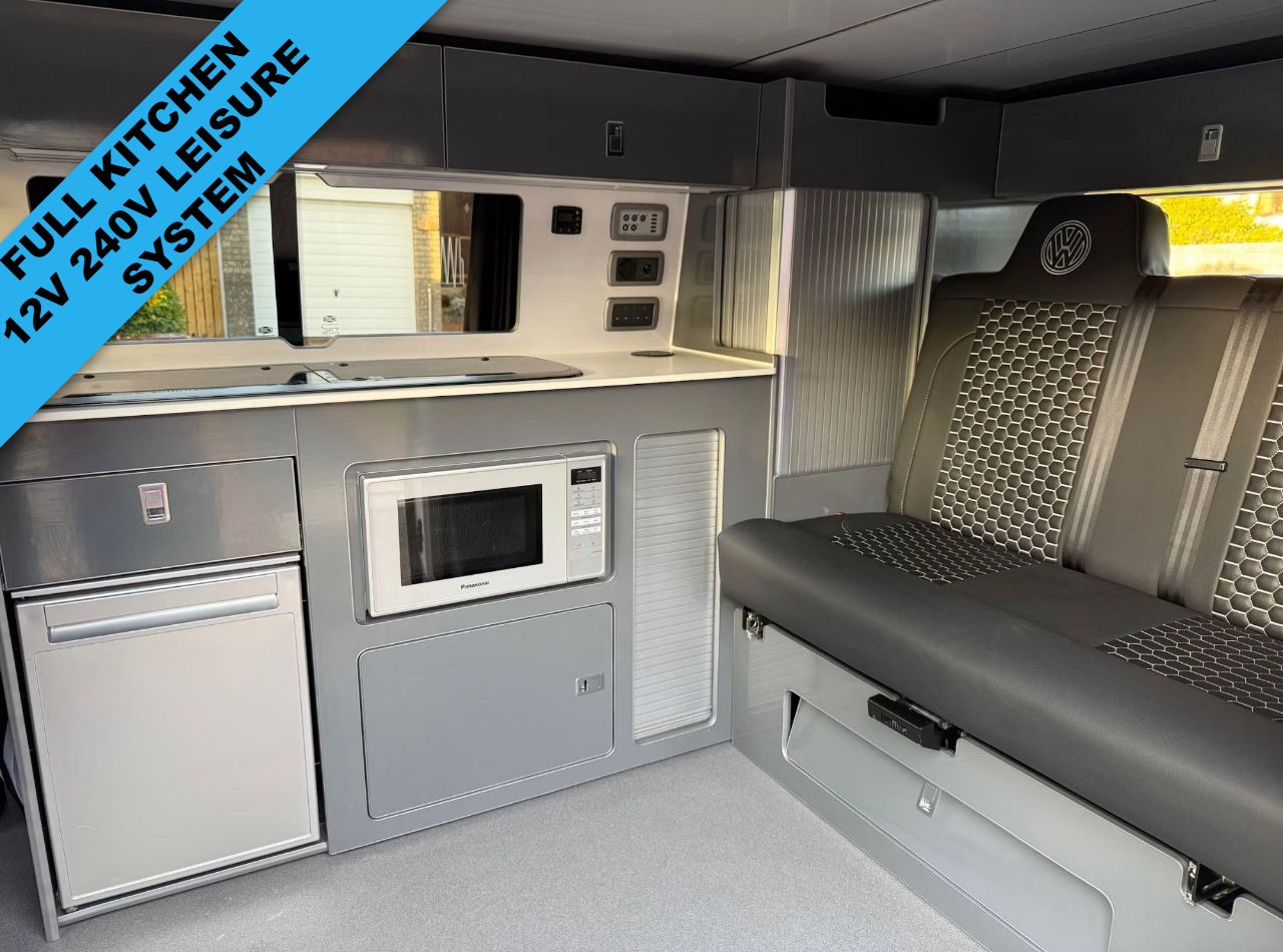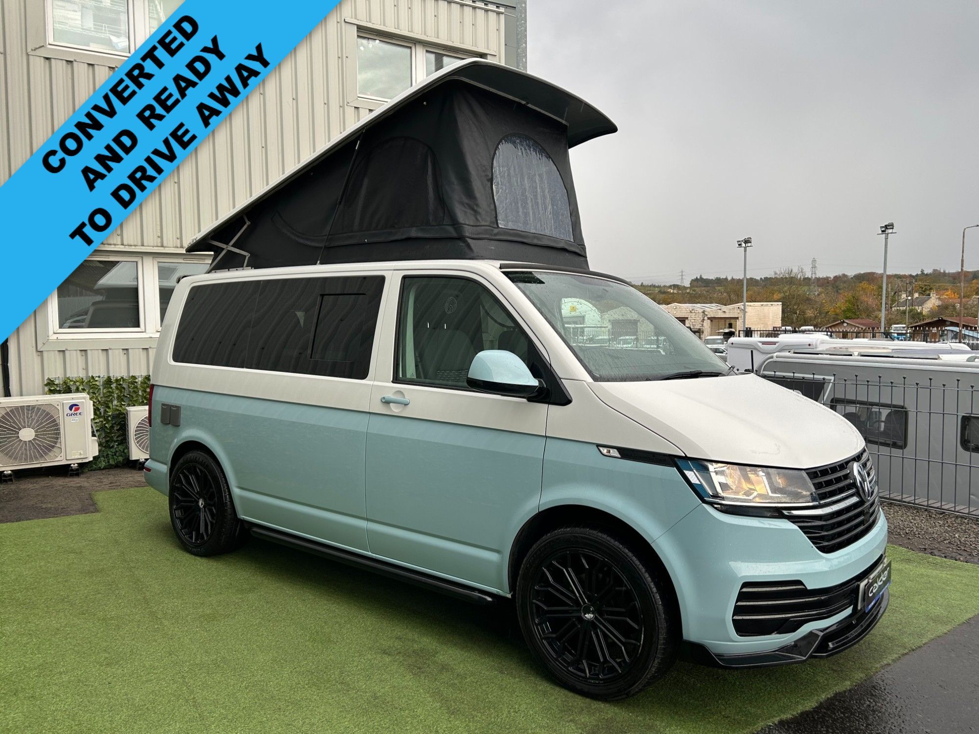 Stunning 2 tone white and sky blue Volkswagen T6.1 fully converted campervan with a premium full side conversion which includes Full furniture kit in gloss grey, Rock & Roll double bed, Twin hob, Sink, Diesel heater, Fridge, LED lighting, Black out curtains , Elevating skyline colour coded pop top roof with double roof bed, Front swivel single passenger seat, USB reading lights, wirless charger, Full upholstery re-trim front & rear. Upholstery in black with striking grey highlights and complementing bright kitchen splash back. Inovative Loc8 door stowable dining table DOUBLE BURNER HOB, SINK AND ONBOARD WATER SYSTEM, 12 v FRIDGE, LOC8 DOOR TABLE, PANASONIC MICROWAVE, POP TOP SKYLINE ROOF ROOF, VAMOOSE AWNING RAIL, CAB AIR CON, STEREO WITH APP LINK, SOLAR PANNEL. Externally this van has been fitted with 20" Black alloy wheels lowered suspension and side bars , Front Splitter & rear spoiler. Ask about our amazing deals on tow bars and drive away air awnings
