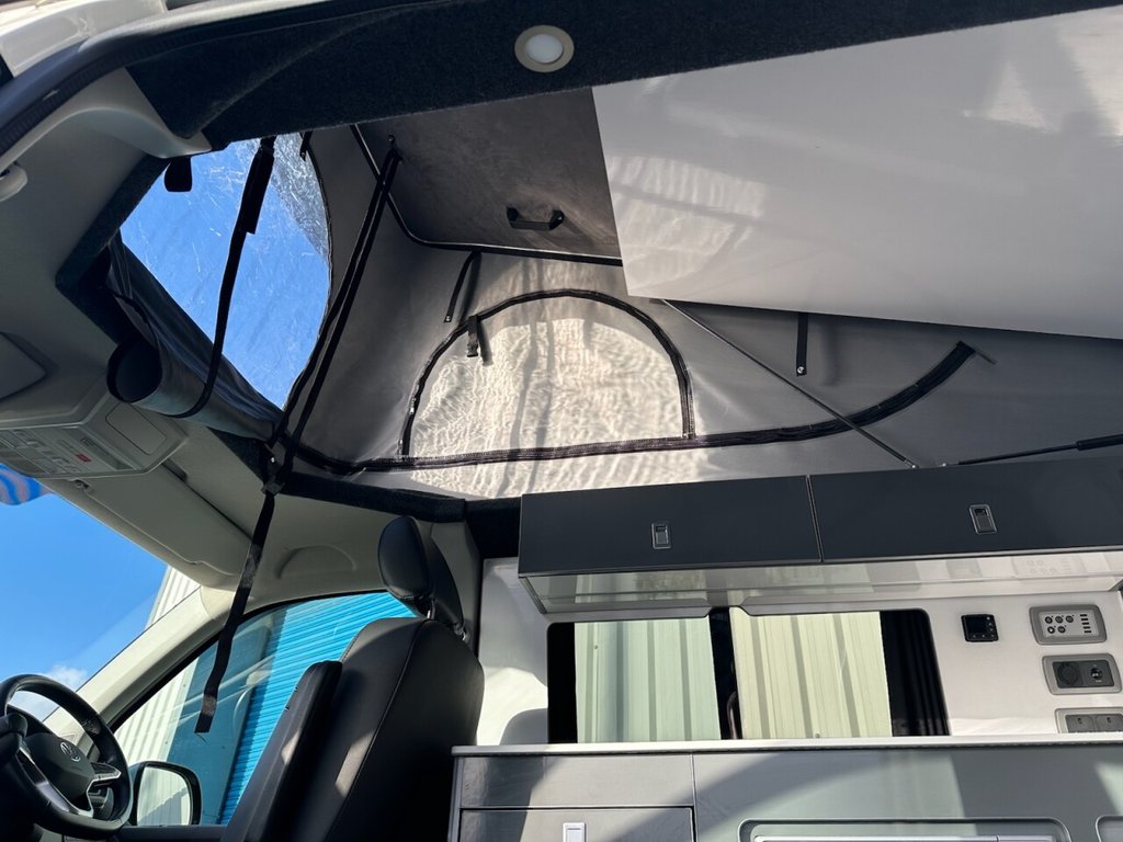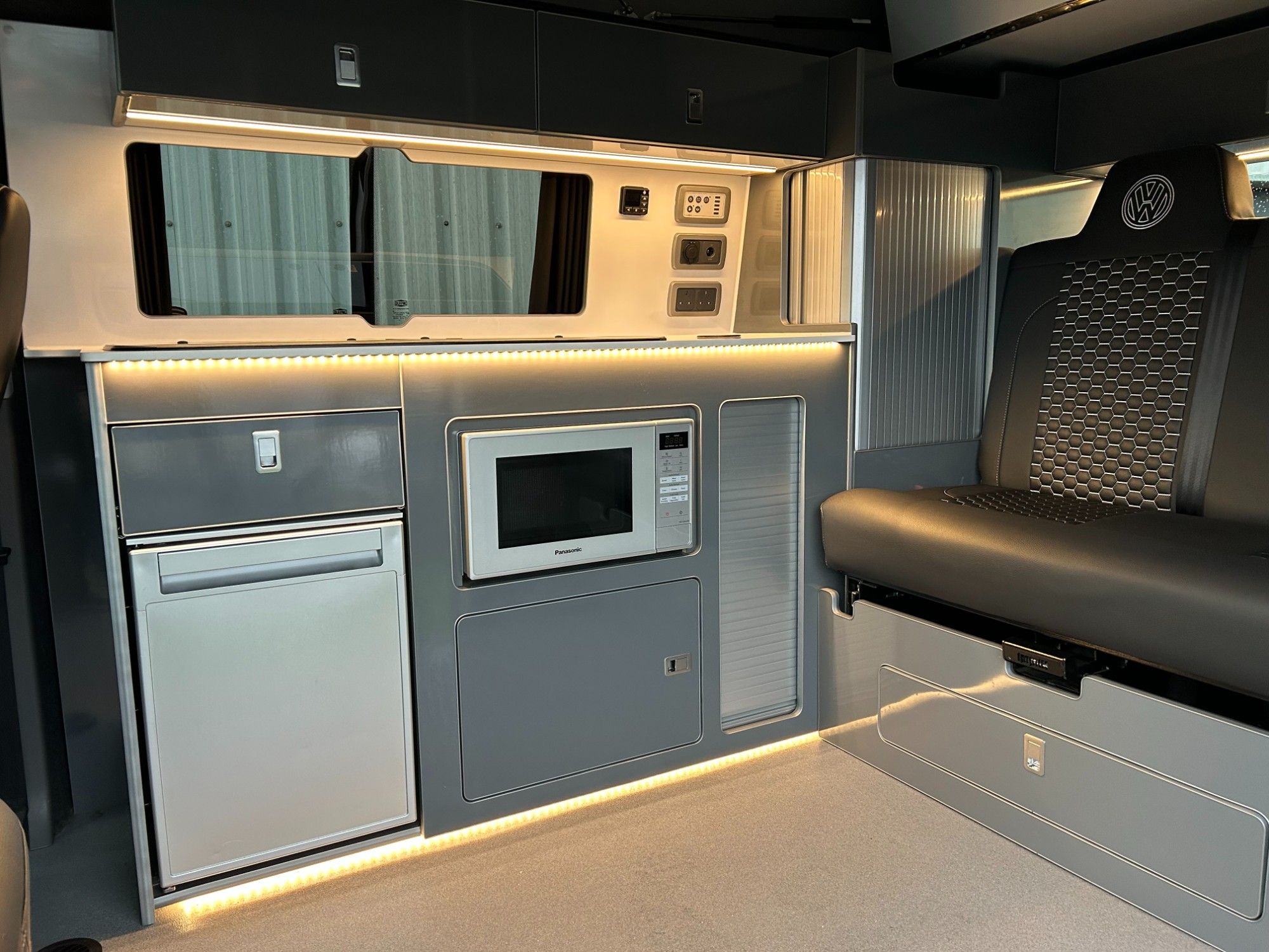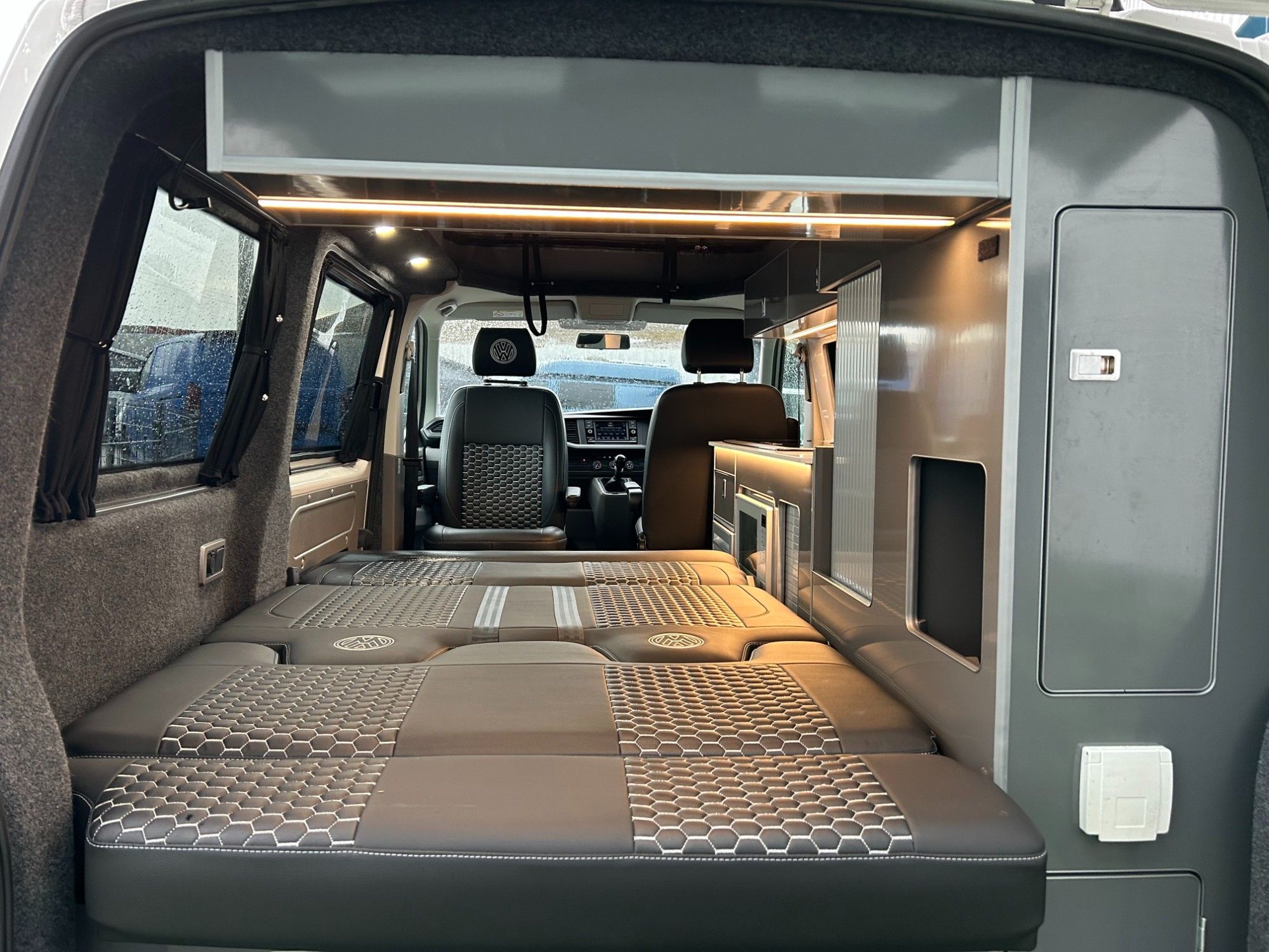 Stunning 2 tone white and sky blue Volkswagen T6.1 fully converted campervan with a premium full side conversion which includes Full furniture kit in gloss grey, Rock & Roll double bed, Twin hob, Sink, Diesel heater, Fridge, LED lighting, Black out curtains , Elevating skyline colour coded pop top roof with double roof bed, Front swivel single passenger seat, USB reading lights, wirless charger, Full upholstery re-trim front & rear. Upholstery in black with striking grey highlights and complementing bright kitchen splash back. Inovative Loc8 door stowable dining table DOUBLE BURNER HOB, SINK AND ONBOARD WATER SYSTEM, 12 v FRIDGE, LOC8 DOOR TABLE, PANASONIC MICROWAVE, POP TOP SKYLINE ROOF ROOF, VAMOOSE AWNING RAIL, CAB AIR CON, STEREO WITH APP LINK, SOLAR PANNEL. Externally this van has been fitted with 20" Black alloy wheels lowered suspension and side bars , Front Splitter & rear spoiler. Ask about our amazing deals on tow bars and drive away air awnings
