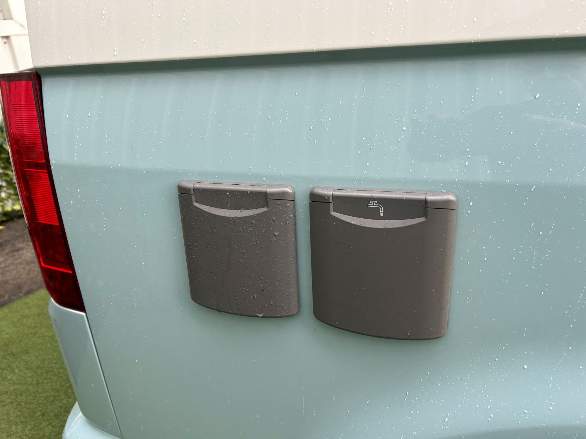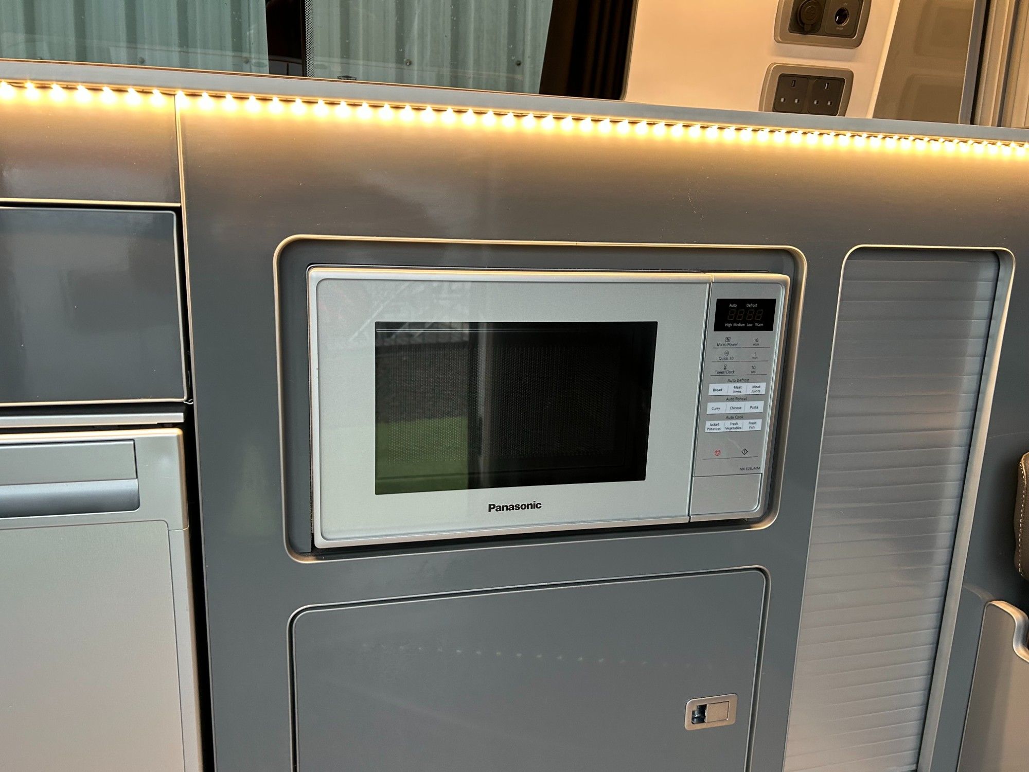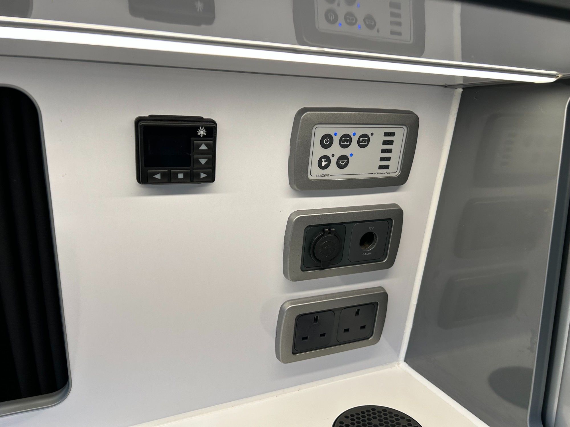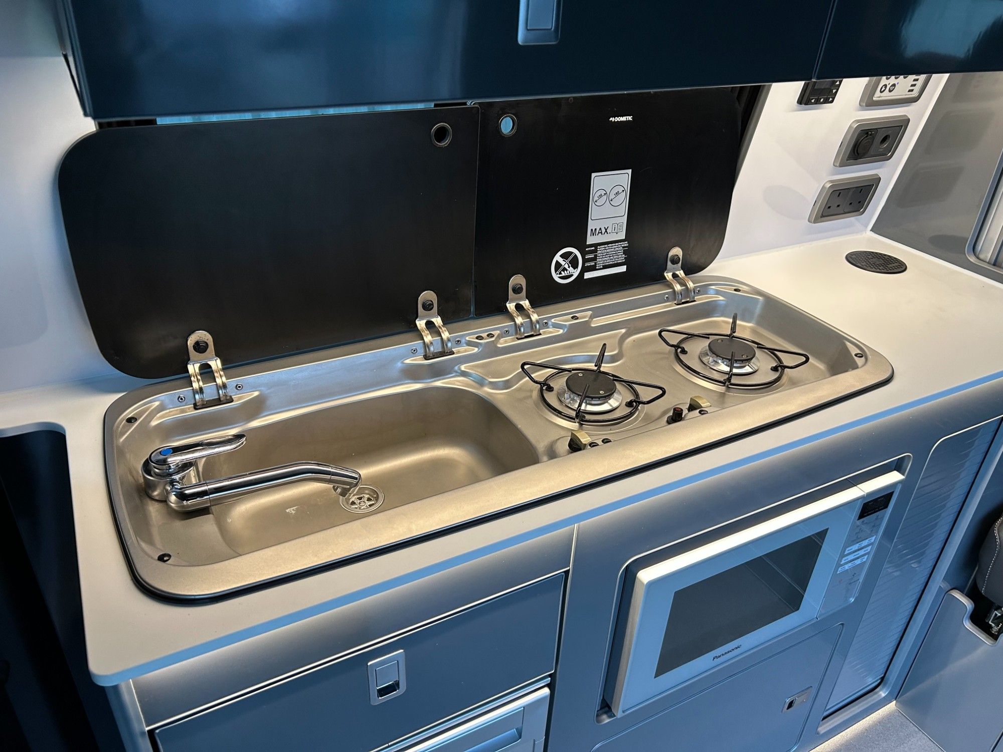 Stunning 2 tone white and sky blue Volkswagen T6.1 fully converted campervan with a premium full side conversion which includes Full furniture kit in gloss grey, Rock & Roll double bed, Twin hob, Sink, Diesel heater, Fridge, LED lighting, Black out curtains , Elevating skyline colour coded pop top roof with double roof bed, Front swivel single passenger seat, USB reading lights, wirless charger, Full upholstery re-trim front & rear. Upholstery in black with striking grey highlights and complementing bright kitchen splash back. Inovative Loc8 door stowable dining table DOUBLE BURNER HOB, SINK AND ONBOARD WATER SYSTEM, 12 v FRIDGE, LOC8 DOOR TABLE, PANASONIC MICROWAVE, POP TOP SKYLINE ROOF ROOF, VAMOOSE AWNING RAIL, CAB AIR CON, STEREO WITH APP LINK, SOLAR PANNEL. Externally this van has been fitted with 20" Black alloy wheels lowered suspension and side bars , Front Splitter & rear spoiler. Ask about our amazing deals on tow bars and drive away air awnings
