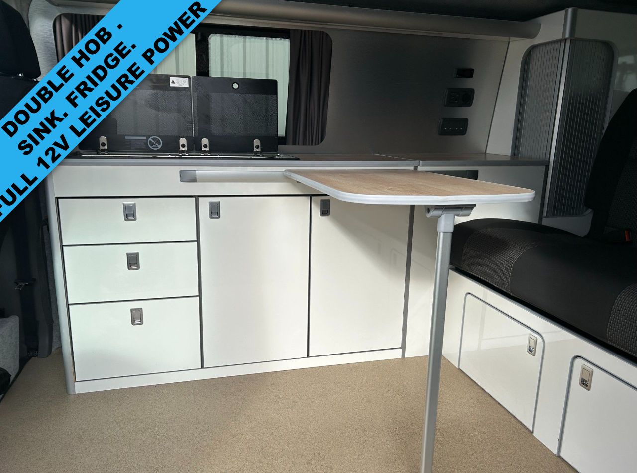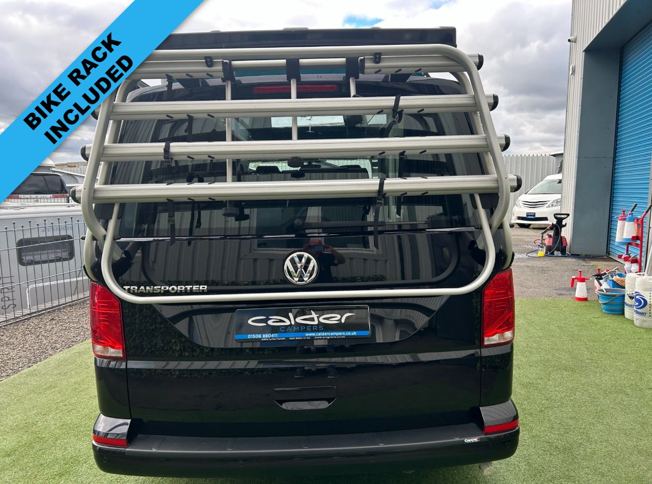 This beautiful VW T6.1 DSG LONG wheel base Highline van with tailgate converted with our premium Full side conversion inc elevating roof bed making a 4 berth. Equiped with 20" alloy wheels and Bike Rack. Ribbed bed system, elevating roof board with roof bed inc mattress, Sink, 2 burner hob, fridge, Diesel heating system with digital display, On board water tank, Gas safe locker inc gas bottle, Full upholstery re-trim front & rear seats, single Swivel passenger seat base, black out curtains, Full LED strip light under top units and worktop, USB charging lights,wirless charger Leisure battery, Split charging system, Power management system, External 240v hook up as well as many other features inc power points and various lighting configurations. tis is the best example of its kind and must be seen to appreciate. All of our vehicles are supplied with a minimum 3 year warranty on the van and conversion MOT (where required) Valet Service Wax and polish HPI check We can offer excellent finance packages of up to 12 years and we take part exchange. Fell free to contact us for any further information.